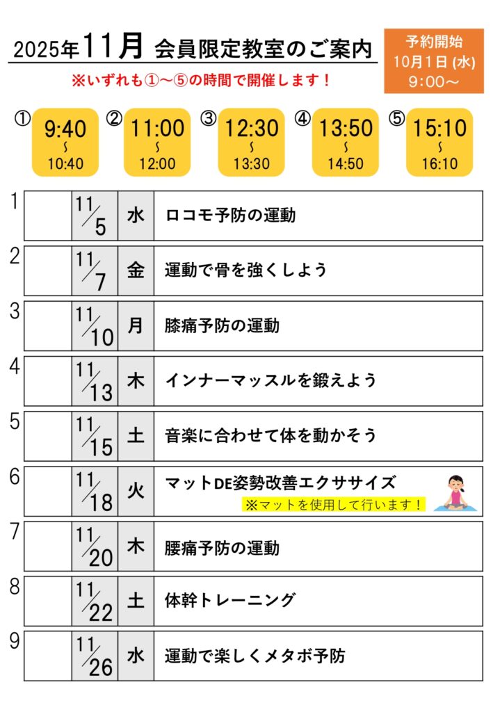 【教室のご案内】 2025年11月 戸塚会員制運動教室の月間予定表です。