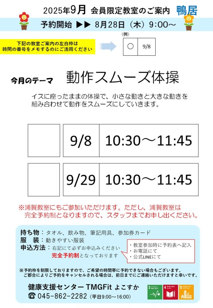 【教室のご案内】 2025年9月 鴨居会員制運動教室の月間予定表です。
