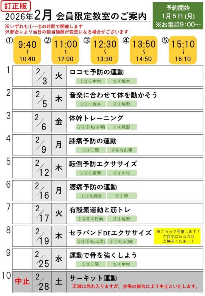 【ご案内】戸塚会員制運動教室 2026年2月予定表