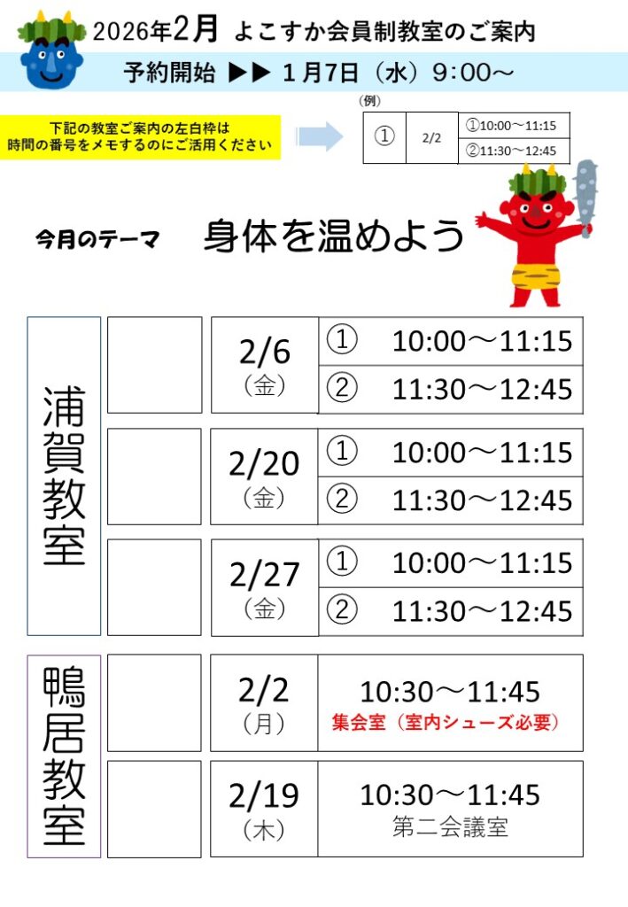 【教室のご案内】 2026年2月 浦賀&鴨居会員制運動教室の月間予定表です。