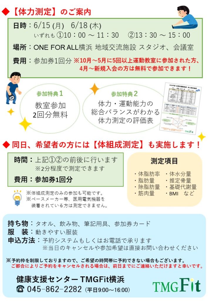 【ご案内】戸塚会員制運動教室 体力測定の開催